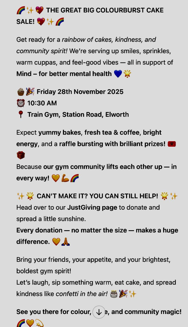 "We thought we'd do something a bit different this year so we're having a colourburst cake sale at Train gym in Elworth. It's my gym and I go there whenever I can.