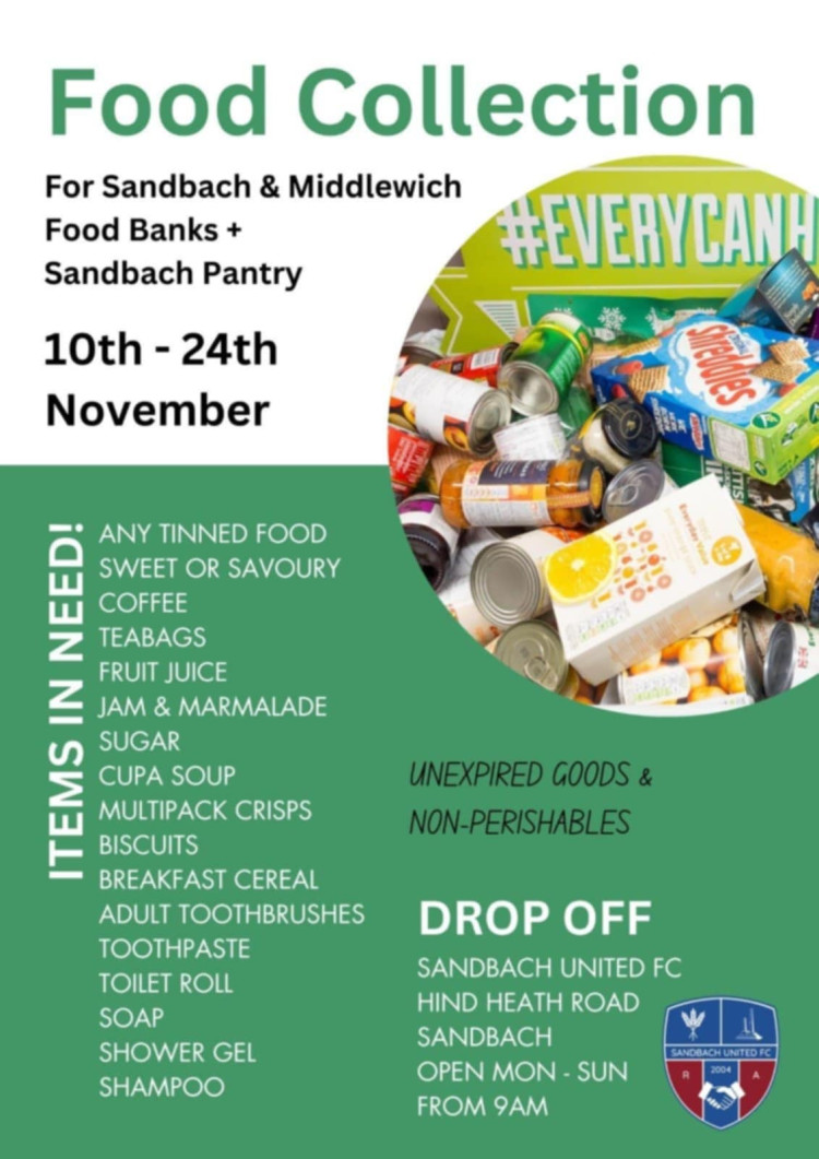 Sandbach United Football Club's annual food collection for Sandbach and Middlewich foodbanks is open.