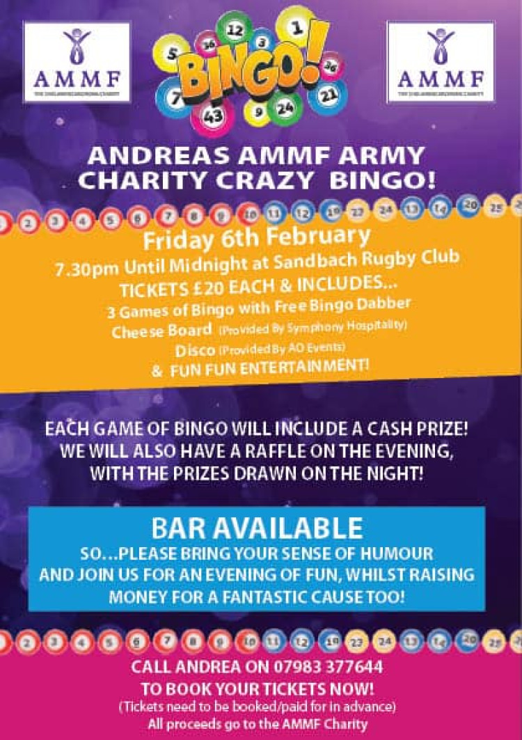 It's Andrea's AMMF Army charity Crazy bingo night at Sandbach rugby club in Bradwall Road. Tickets are £20 which includes three games of bingo, cheese board and disco. Always a fun night!