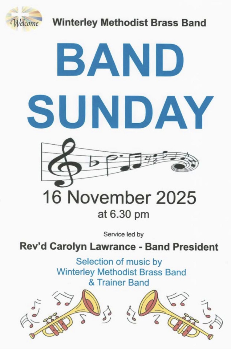 At Winterley Methodist Church, there's a 'Band Sunday' event with Winterley Methodist Brass Band at 6.30 pm. Don't miss it!