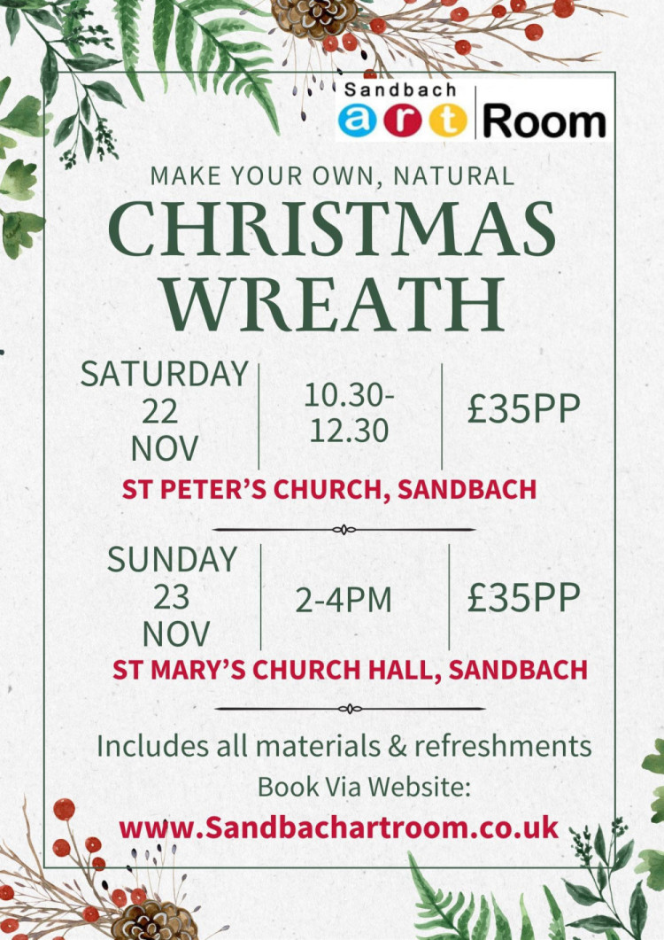 Fancy making your own Christmas wreath? Sandbach Art Room has the first of its Christmas wreath workshops at St Peter's Church hall from 10.30 am until 12.30 pm. The cost is £35. Book through their website here