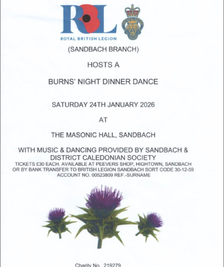 The Sandbach branch of the Royal British Legion is holding a Burns' Night dinner dance at the Masonic Hall with music and dancing provided by the Sandbach and District Caledonian Society. Tickets are £30 and details are on the image below.