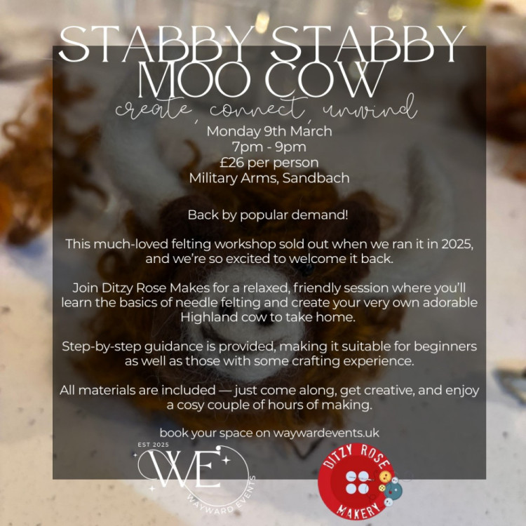 Ever wanted to try the art of felting? The Military Arms has a felting workshop from 7 pm until 9 pm. Details on the image below.