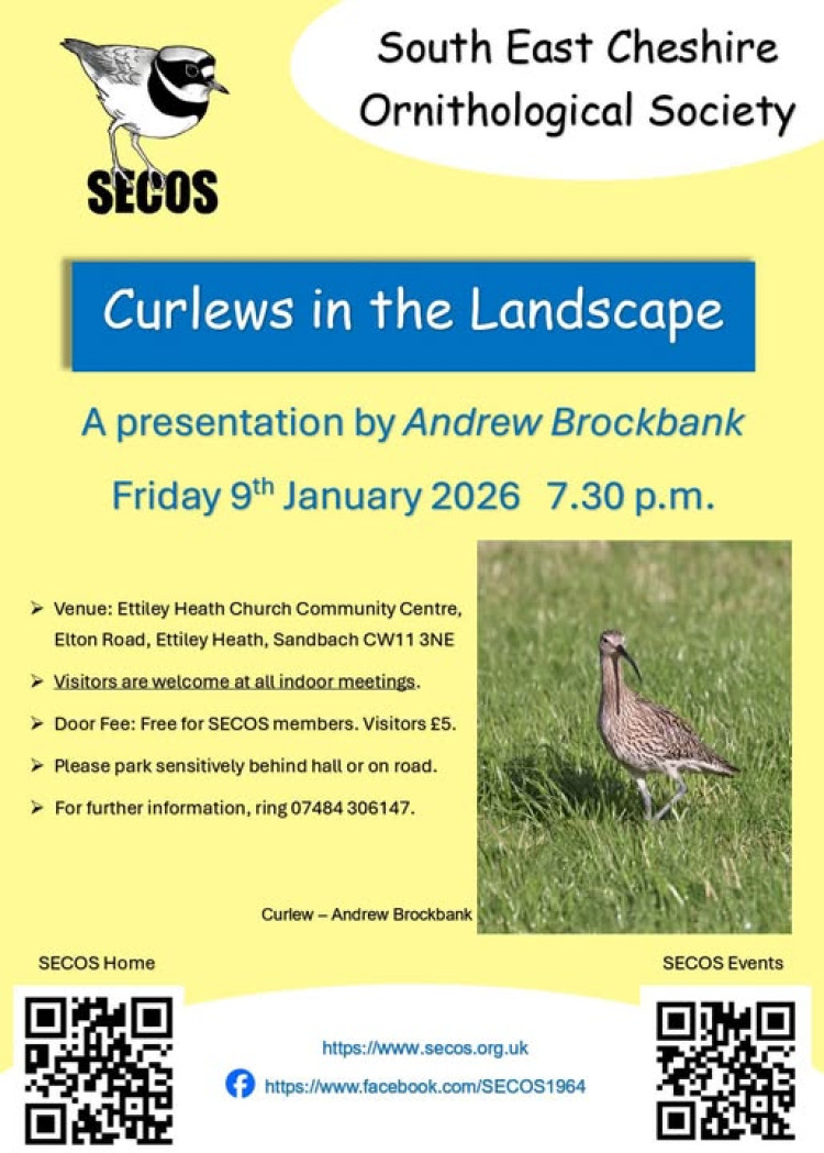 Something entirely different - a presentation at the South East Cheshire Ornithological Society in Ettiley Heath. South East Cheshire Ornithological Society has its monthly meeting at Ettiley Heath Church Community Centre in Elton Road, Ettiley Heath. Curlews in the Landscape, a presentation by Andrew Brockbank takes place at 7.30 pm. Free for SECOS members. Visitors £5. New members always welcome.