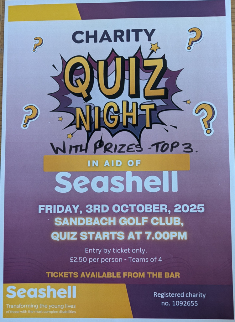 At Sandbach Golf Course, there's a fundraising charity quiz and raffle in aid of Seashell. Winning team gets a £100 meal voucher for four people. Raffle prizes include vouchers for boutiques, butchers, jewellery shops in Sandbach area plus lots more.