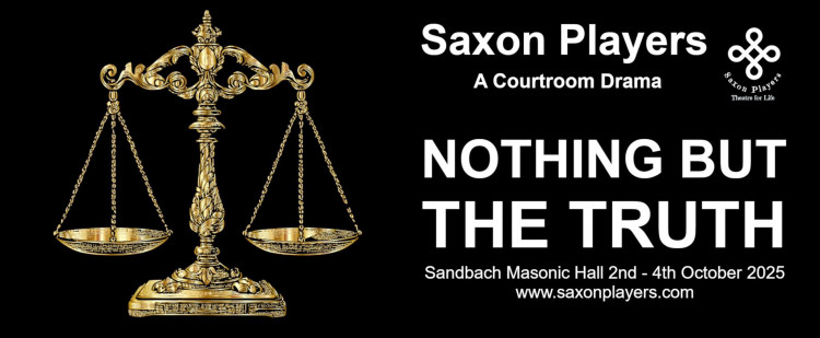The Saxon Players begin their run of their latest production, "Nothing But The Truth" at Sandbach Masonic Hall. Prosecution begin their case at 7.30pm prompt and end about 9pm. After a 20 minute break the case for the Defence will begin. Whatever the verdict we expect to be done by around 10.30 pm. Limited tickets available at www.saxonplayers.com