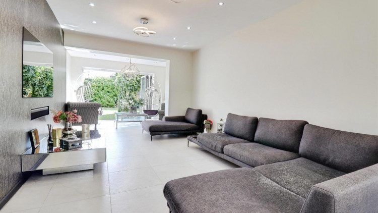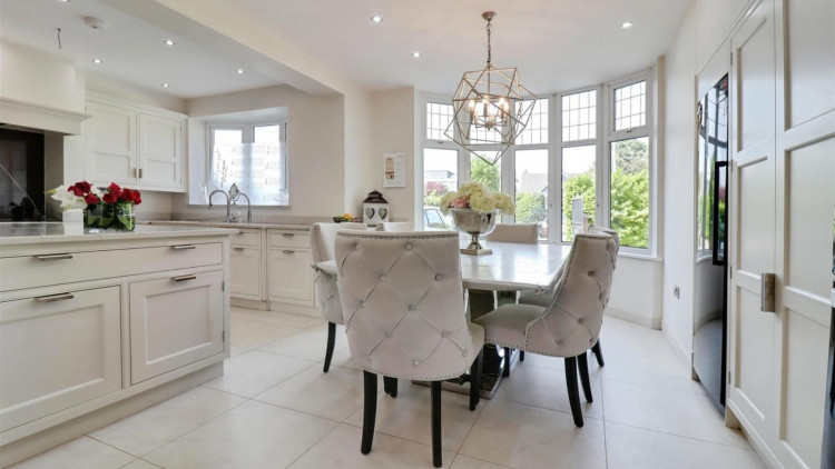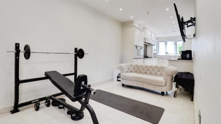 The highlight of the home is the bespoke kitchen, flowing seamlessly through to three reception areas, currently utilised as a dining area, family area, and home gym.